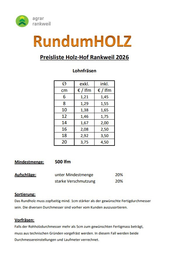 Falls der Rohdurchmesser mehr als 5 cm zum gewünschten Fertigmass beträgt, muss aus technischen Gründen vorgefräst werden. In diesem Fall werden beide Durchmesser und Laufmeter verrechnet.
