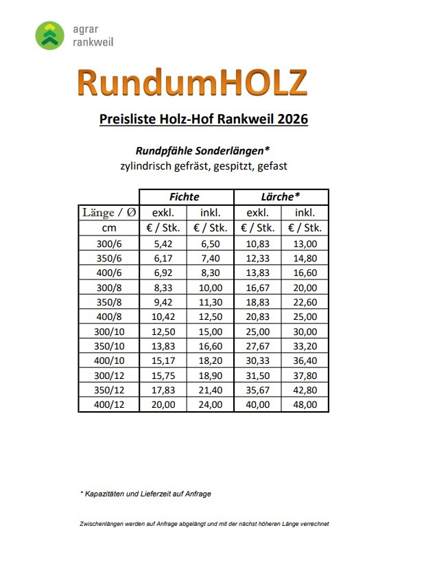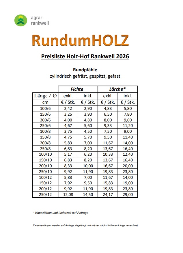 Sie sind hier: Startseite » SHOP Rundholzpfähle Rudpfähle zylinderisch gefräst, gefast, gespitzt.Holzarten: Fichte, Tanne, Lärche Preisliste Rundpfähle Preisliste Rundpfähle Sonderlängen Rindenmulch Partyofen, Feuerkerzen